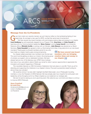 ARCS Pittsburgh Fall 2023 Newsletter Posted on Tuesday, October 24, 2023 Click on the link to view the newsletter Log in to post comments Archives 2026 2025 2024 2023 2022 2021 2020 2019 2018 2017 2016 2015 2014 2013 2012 « ‹ › »