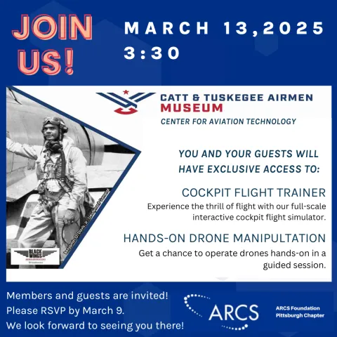 Join us! Posted on Thursday, March 13, 2025 Join us for a Tour! CATT & TUSKEGEE AIRMEN MUSEUM Center for Aviation Technology Thursday, March 13th From 3:30 to 5:00 Center for Aviation Technology 400 Sherwood Road, Wilkinsburg, PA Register HERE Log in to post comments Archives 2026 2025 2024 2023 2022 2021 2020 2019 2018 2017 2016 2015 2014 2013 2012 « ‹ › »